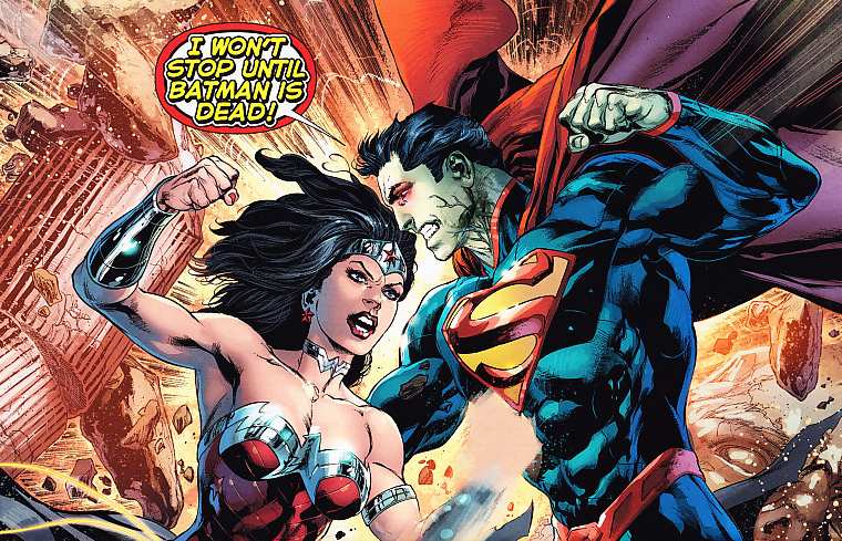 "Trinity War. Chapter Six: Conclusion" escrito por Geoff Johns, dibujado por Ivan Reiss, entintado por Joe Prado, Oclair Albert & Eber Ferreira y coloreado por Rod Reiss con Doug Manhke y Alex Sinclair para la portada. Muchas personas han intervenido en la realización de este comic pero dejando al lado la historia, lo que más llama la atención son los dibujos realizados por estas cinco personas y realmente se han lucido. Contiene páginas dobles espectaculares como la que dejo abajo de este pérrafo, y contiene la curiosidad del nacimiento de una nueva colección con nuevos personajes a la que intentan obligarnos a comprar, como hace siempre la DC, poniendo, como podemos ver arriba, en la última página de la aventura: Continuará en "Forever Evil #1" que es la nueva colección y que en el catálogo PREVIEWS de este mes, donde como siempre vienen las colecciones avanzadas, hay un montón de ejemplares de "Forever Evil" con una gran cantidad de "crossovers" con el resto de colecciones de la editorial americana. La colección ya se podía conocer desde el catálogo de julio que se anunciaba en portada. Si tienes mucho dinero podrás gastarlo tranquilamente en la compra de una gran cantidad de comics relacionados.